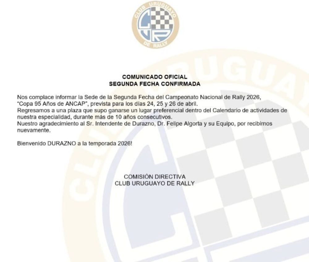 Por otra parte, en el comunicado se agradece muy especialmente al Intendente de Durazno, Dr. Felipe Algorta y a todo su equipo por la posibilidad de recibir al rally uruguayo.